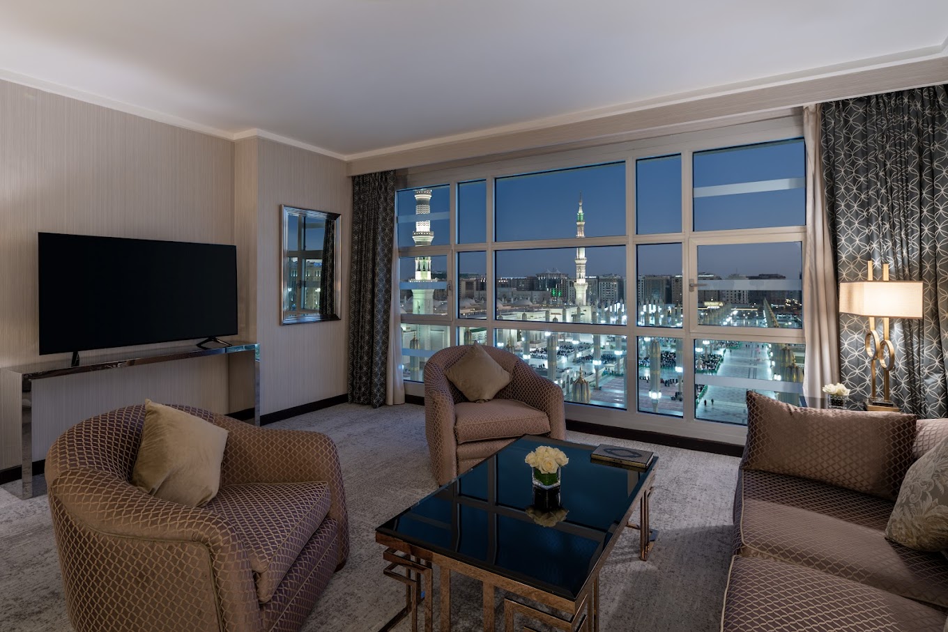 يحتوي الفندق على مجموعة من المطاعم التي تقدم مأكولات محلية وعالمية، بالإضافة إلى خدمات مثل النقل من وإلى الحرم، ومرافق استجمام متنوعة. موقعه المتميز بالقرب من الحرم النبوي يجعله خيارًا رائعًا للزوار الذين يبحثون عن تجربة إقامة فاخرة ومريحة أثناء زيارتهم للمدينة المنورة.